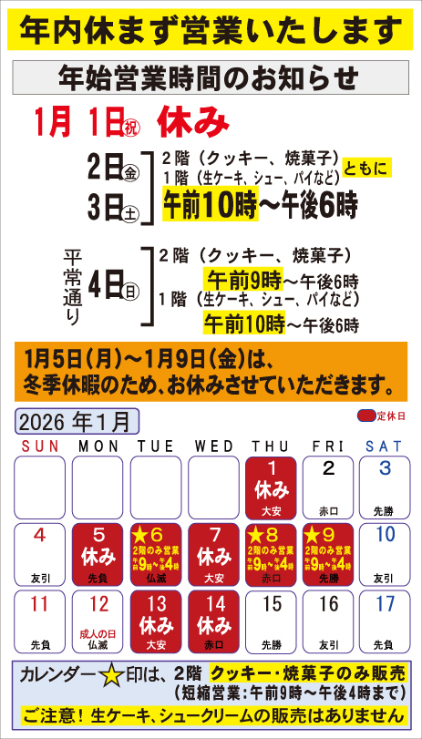 2階 午前9:00から午後6:00(クッキー、焼菓子)