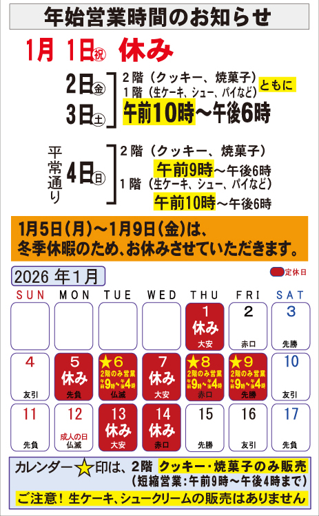 1階 午前10:00から午後6:00(生菓子、シュー、パイなど)